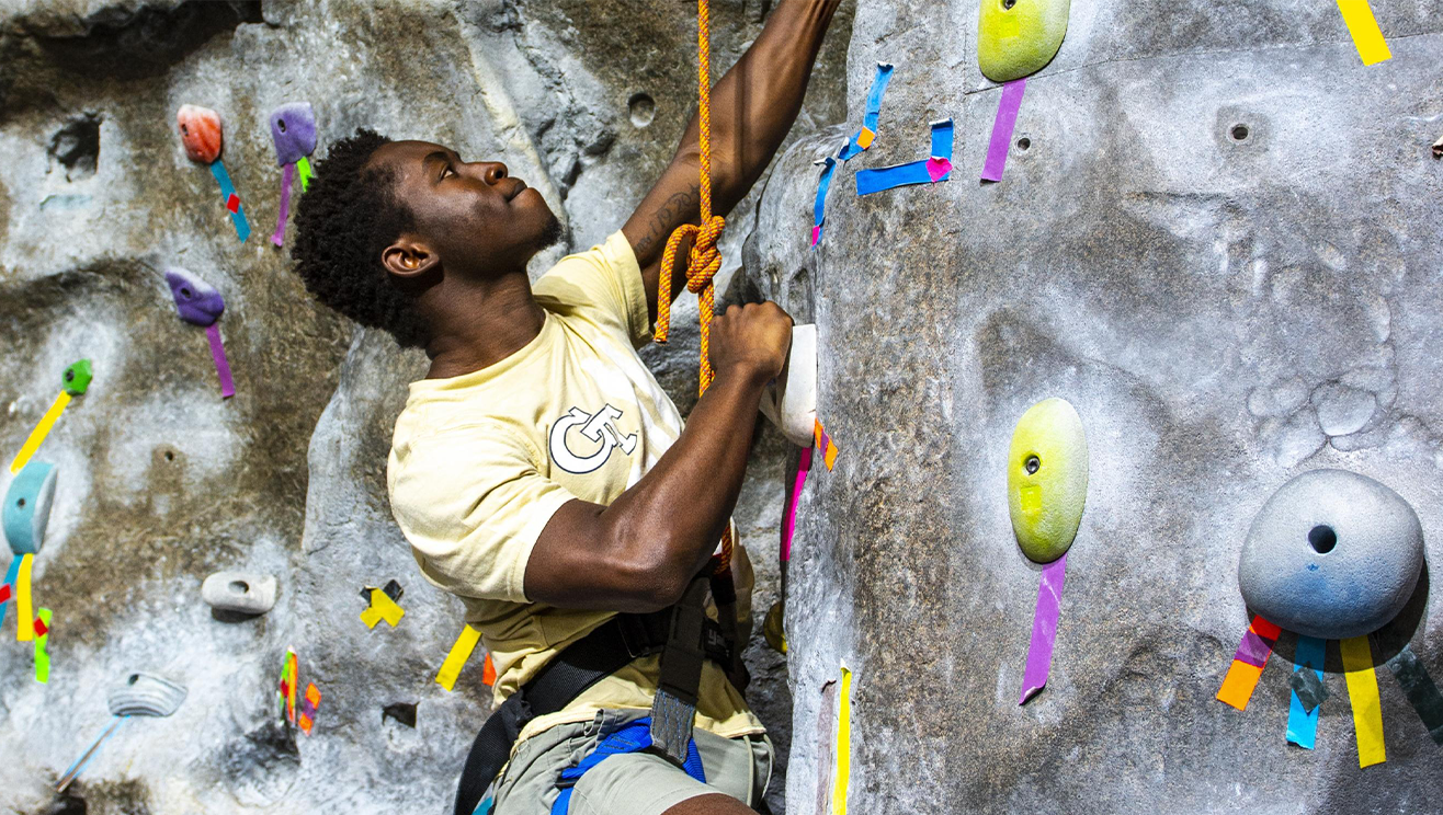 “I love rock climbing! It’s a lot of fun and a great way to exercise,” says schoolteacher Sha Fanion, who has been climbing outdoors at Stone Mountain for a few years and sometimes visits the indoor wall at Georgia Tech with friends. “It’s one of those activities that engages the total body. More specifically, it helps tone your core and leg muscles.”